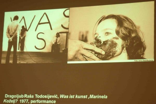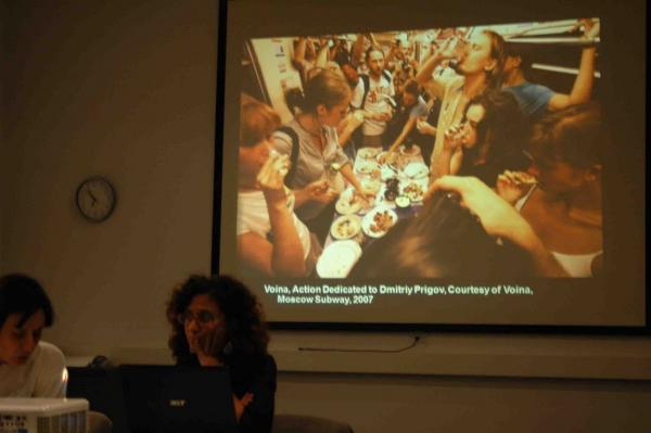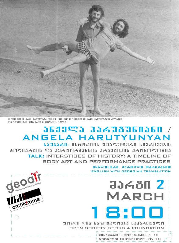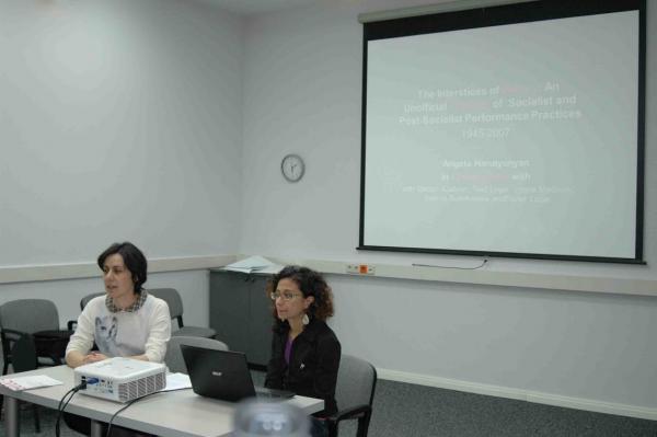 In her presentation Angela Harutyunyan refered to a collaborative research project conducted with Joanna Sokolowska, Tevz Logar, Vesna Madzoski, Vardan Azatyan and Eszter Lazar and entitled ‘A Timeline of Performance and Body art Practices from Eastern Europe and Former USSR’. This project epitomizes the larger methodological and art historiographical concerns that inform Angela Harutyunyan’s work. It is a collaborative publication with several art curators and historians facilitated by her. It constitutes a methodological narrative as well as political and artistic timelines encompassing the period between 1949-2007. In this project, the two main areas of Angela Harutyunyan’s practice - art history research and curating - intersect: art history writing comes out as a mode of curating, and curating appears as a historically grounded practice.
