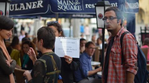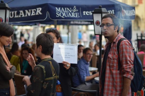 For many contemporary artists and cultural operators, global mobility is an essential part of their lives and work. The network in which artists operate, which increasingly determines the modern society’s organization and production, also sheds light on the image of globalism - a world of people on the move. The guided trips that artists from 6 countries of the Eastern Partnership (Armenia, Azerbaijan, Belarus, Georgia, Moldova, Ukraine) offered in the city of Krakow, without having prior experience of being there, dealt with these issues. This was an encounter of two aliens when a guest claims to be a guide in a host country. On the basis of their own research and interests, artists designed their own city tours, referring to the place of their origin and departure. The willingness to delve deeper and to understand better led to manifold results. Generally, a tour includes the act of leaving and then returning to the starting point, and therefore, one who undertakes such a journey can be called a tourist. How much of a tourist we will become by coming back to the original starting point or how far we travel, is always up to us, individuals permanently on the move.