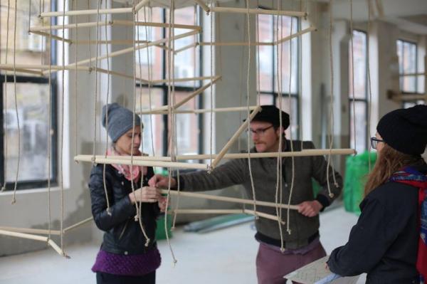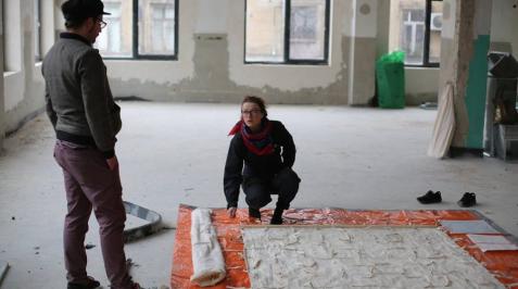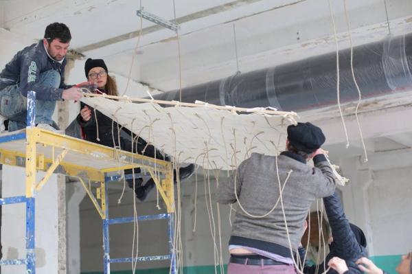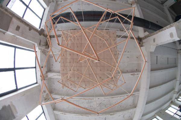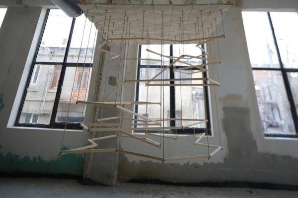 For "The Tbilisi Chess Palace" project Iza Tarasewicz has created a work Knight's Tour. It takes its departure from a Knight movement diagram, an isolated motion of knight figure. The installation is a try to turn a two dimensional movement of a knight figure into a 3 dimensional object and imagine it in a space.