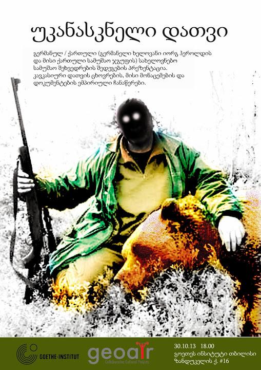 The information about bear population, shooting quotas do not exist, which is an ideal environment for hunting without any restrictions. Jörg Herold with the project 'The Last Bear' tries to raise awareness about the issue. Together with the Georgian artists, the historical documentation was created; the journalists and animal protection activists were interviewed about bear hunting. The concept of treating the bears was formulated artistically into a social problem.