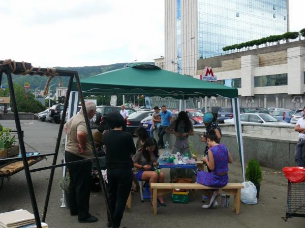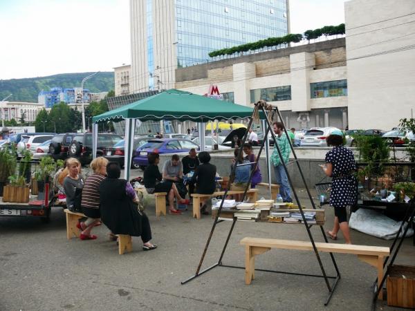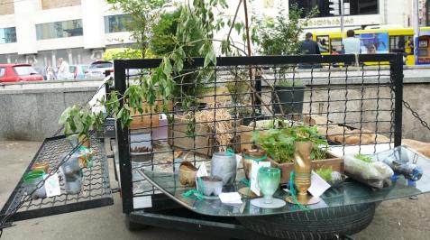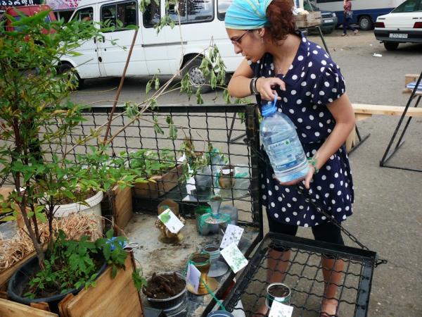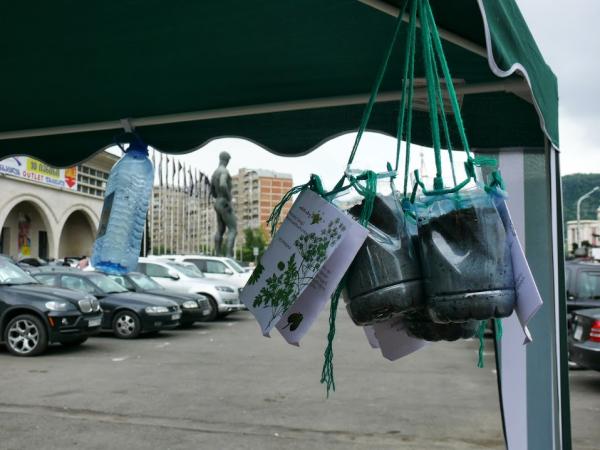 For a day, the project “Garden on the Wheels” hosted a collaborative project called “Herbening” organized by anthropology student Ana Ramazashvili and GeoAIR. This time, the plants of the garden were herbs. It was possible to buy pots with planted herbs, such as: coriander, parsley, dill, basil – the seeds of these herbs were available for the purchase as well. These herbs were provided in alternative pots, made from recycled plastic bottles, tetra packs and containers.