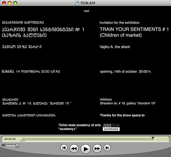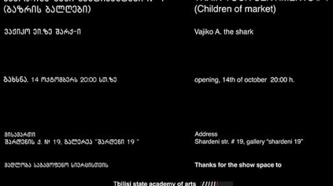 Vajiko A. Shark, born in 1985 Tbilisi, Georgia, lives and works in Berlin, Germany. From 2003 to 2007 Vajiko studied at the Multimedia Studio Department of the Tbilisi State Academy of Arts. He and his fellow students (Giorgi Gagoshidze, Giorgi Marr, Elene Naveriani, Melano Sokhadze and Mari Tsiklauri) have been members of the Group LOTT. Being young and provocative, criticizing the conservative educational system at the State Academy, the group has caused many conflicts and discussions in the art society. After having attended classes at Gerrit Rietveld Academy in Amsterdam, Vajiko moved to Berlin to continue working. The artist provokes his audience by trying to act through a conflict deliberately activated against the system and its well-established order, to produce space for different expressions and to break through the established views and life habits.